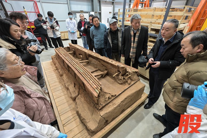 巴达木东墓群考古发掘领队尚玉平(右二)在实验室考古方舱内向专家们介绍墓葬M20出土的彩绘木棺座(2月1日摄)。 新华社记者 李贺 摄