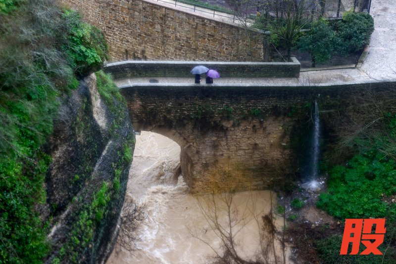 2月4日,在西班牙龙达,人们在一座桥上观察河流水势。 新华社/路透